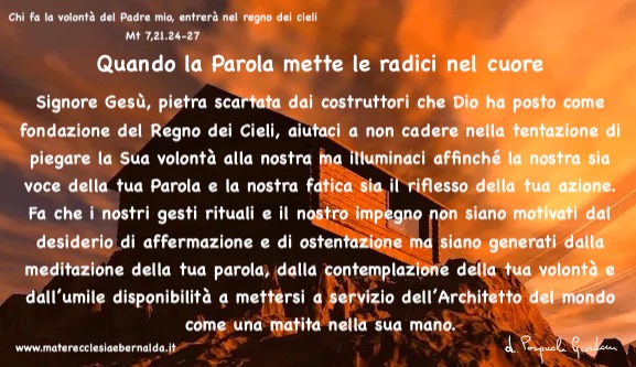 A conclusione del cosiddetto discorso delle beatitudini, Gesù mette a confronto due tipi di persona: il sapiente e lo stolto. La differenza emerge quando si è sferzati dalle prove della vita, solo allora si rivelano i fondamenti sui quali poggiamo le nostre scelte. Il vincitore o il perdente si manifesta per quello che è alla fine, quando si raggiunge la meta della vita, che è vivere la piena intimità familiare con Dio tale da chiamarlo Padre. La fede in Dio è la solida base, la condizione imprescindibile per ogni altra relazione d’amore che desideri durare nel tempo e resistere nelle difficoltà. Quando posso dire di confidare veramente in Dio? Quando la sua parola penetra nel mio cuore e lo trasforma facendolo fruttificare in opere di amore autentico. L’avvento è tempo dell’ascolto di Dio affinché la sua Parola diventi carne nelle nostre azioni quotidiane. Quando la Parola mette radici nel nostro cuore, la vita non poggia sulle sabbie mobili ma sulla roccia della verità e rimane stabile.